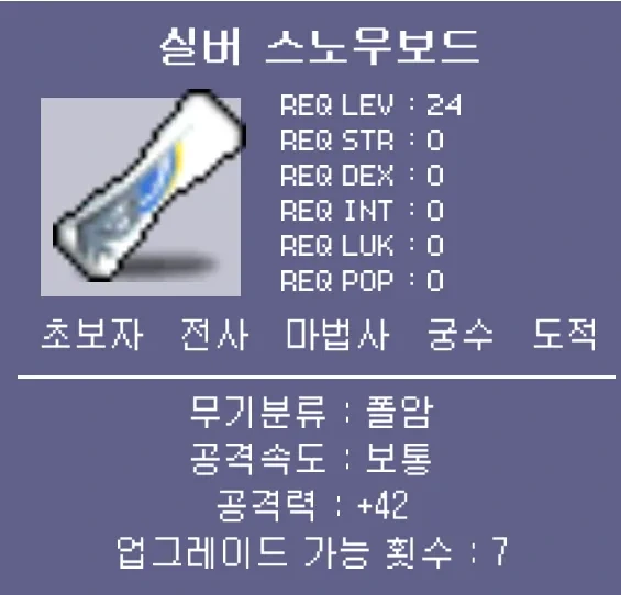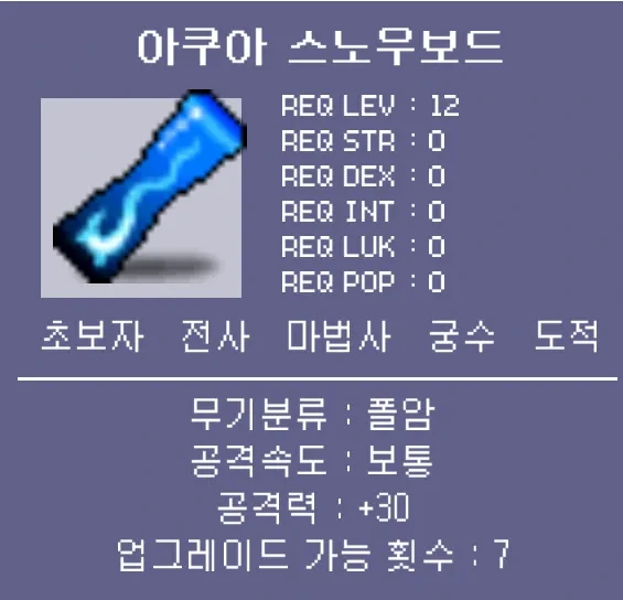 스카이·아쿠아·실버·골든·다크·블러드·메이플 스노우보드까지 총 7종이 준비되어 있으며 전부 영구 소장이 가능합니다. 이 장비는 교환도 가능하여 컬렉션이나 거래용으로도 활용할 수 있습니다.