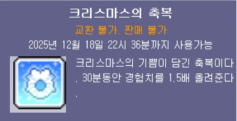 여기서 획득하는 ‘크리스마스의 축복’은 일정 기간 능력치를 크게 올려주는 버프로, 사냥이나 보스에 활용 가능하기 때문에 꾸준히 챙겨두면 시즌 동안 매우 유용합니다.
