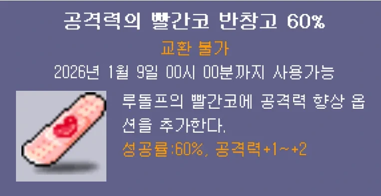 60% 강화 주문서 형태이기 때문에 장비 강화용으로 쓰기 괜찮고, 1월 9일까지 사용 가능합니다.