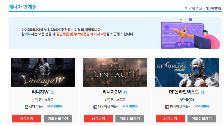 아이템매니아에서는 이달의 추천게임 참여하는 분들에게 할인쿠폰 및 무료이용권 패키지를 지급해드린다고 합니다! 상품 받으면서 거래까지 하면 일석이조 아닐까요? 그럼 오늘도 리니지W 플레이 재밌게 하세요! 다음에도 유용한 정보 전달 하겠습니다! 감사합니다 :)