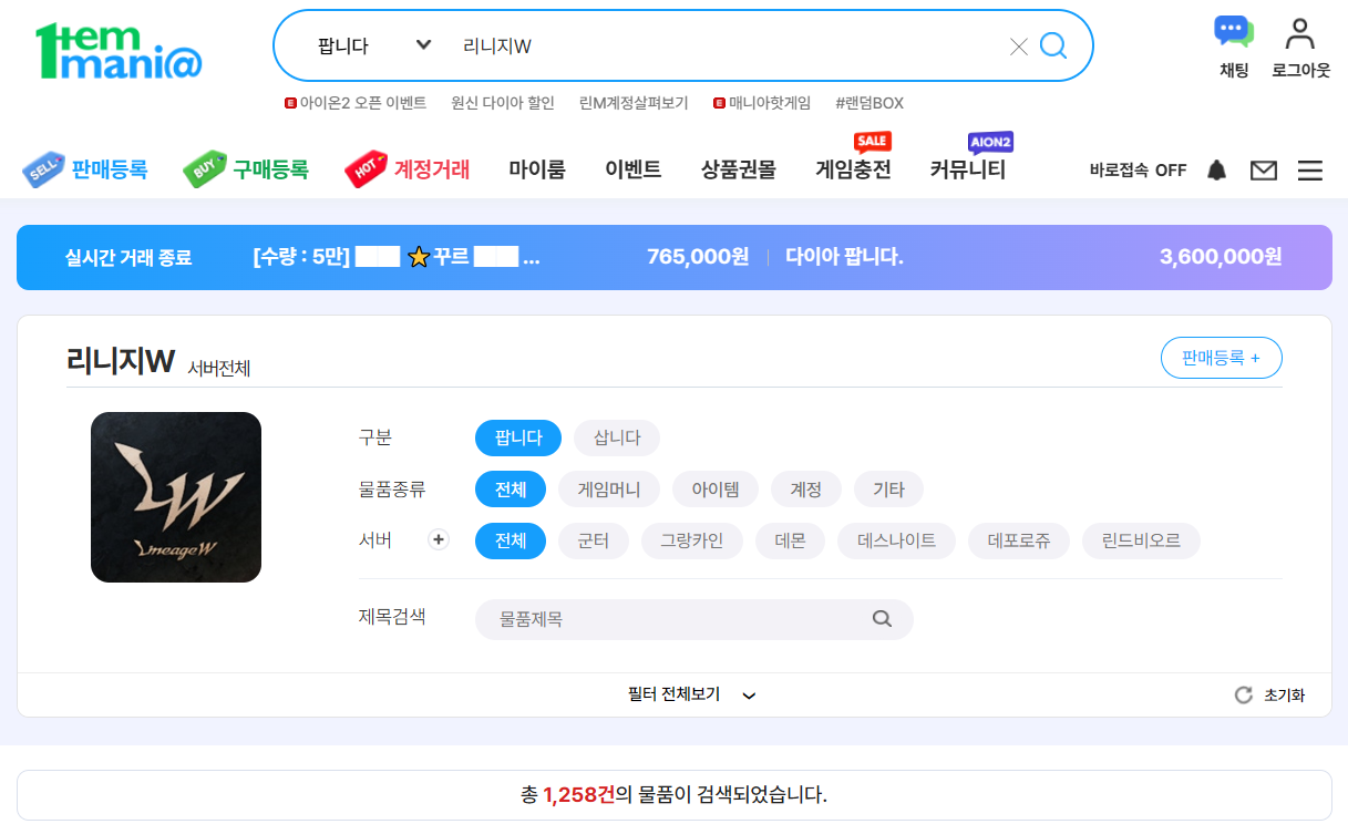 그렇기 때문에 리니지W 계정 거래를 고려한다면, 개인 간 직거래보다는 아이템매니아와 같은 플랫폼을 통해 실시간 시세와 매물 흐름을 먼저 확인하는 과정이 필수적입니다. 아이템매니아는 안전거래 시스템을 기반으로 거래가 종료될 때까지 대금을 보관해 주기 때문에 사기나 회수 위험을 줄일 수 있으며, 거래 이력과 매물 비교도 한눈에 가능해 초보자에게도 접근성이 좋은 편입니다.