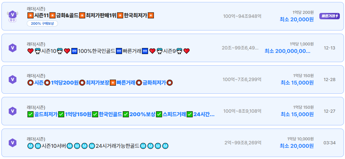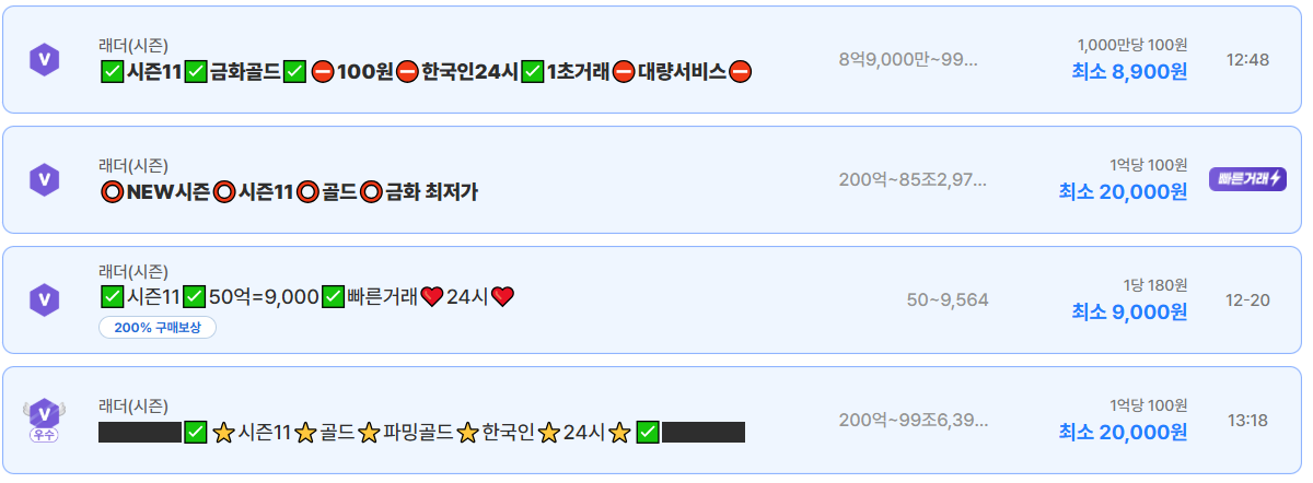 시세를 보면 현재 시장이 얼마나 안정화됐는지도 알 수 있다. 시즌11 래더 기준으로 200억 이상 대량 골드는 1억당 100원 수준에서 최저가 경쟁이 치열하고, 소량 골드는 1억당 150~200원 선에서 형성된다. 스탠다드 서버 역시 큰 틀에서는 비슷한 가격대를 유지하고 있으며, ‘노가다 골드’, ‘개인 파밍 골드’ 같은 키워드를 내세운 매물도 꾸준히 거래 종료되고 있다. 이는 공급이 충분하다는 의미이기도 하다.