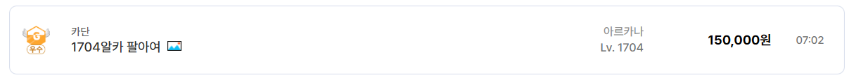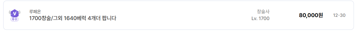 우선 전체적인 시세 기준을 보면 1700~1720 구간의 단일 캐릭 계정은 최저 8만 원대부터 형성되어 있다. 예를 들어 루페온 서버 1700 창술사 계정이 약 8만 원, 카단 1704 알카나 계정이 15만 원 선에서 거래되는 사례가 있다. 이 구간은 배럭용이나 복귀 유저가 진입하기 좋은 가격대로 수요가 꾸준하다.