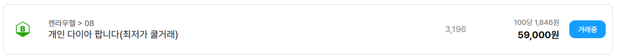 켄라우헬 서버에서는 3,196 다이아가 100당 1,846원, 총 59,000원에 거래 중이다. 최저가, 쿨거래를 강조한 문구에서 알 수 있듯이 서버 내 경쟁이 치열해지며 판매자 간 가격 조정이 이루어지고 있는 구간으로 보인다. 이러한 서버는 이벤트 직후나 대규모 업데이트 이전에 시세 변동이 크게 나타나는 경우가 많아 구매 타이밍을 잘 잡는 것이 중요하다.