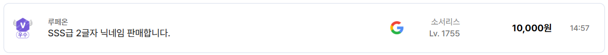 한편, 루페온 서버에서 등록된 SSS급 2글자 닉네임 소서리스 계정이 1만 원에 책정된 사례는, 캐릭터 성능과 별개로 닉네임 거래가 독립적인 영역으로 존재한다는 점을 보여준다. 하지만 이런 특수 거래는 일반적인 계정 시세 분석과는 구분해서 볼 필요가 있다.